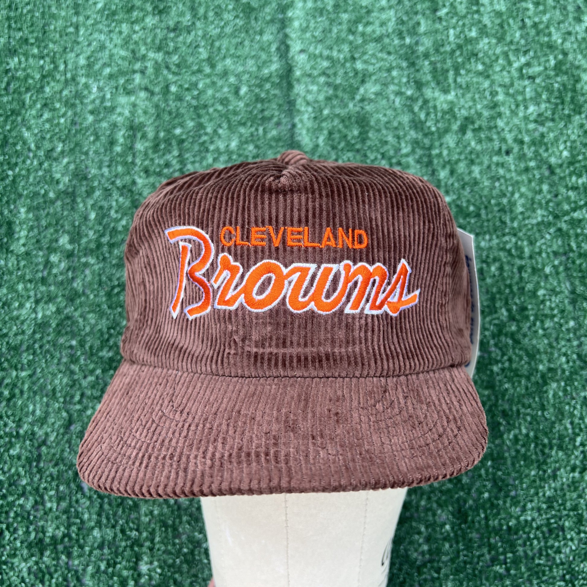 Vintage Sports Specialties Cleveland Browns hat in brown corduroy. Classic script logo with rare zipback closure. New With Tags (NWT), authentic 1990s piece – perfect for NFL fans, vintage hat collectors, and retro streetwear.
